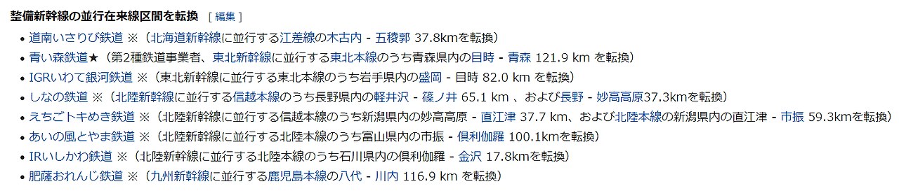다른 구간과 다른 모습의 제3 섹터 철도는 사실 간선철도의 일부분이었다. 그러나 신칸센이 개통됨에 따라 승객 수요가 급감할 것으로 예상되는 구간은 제3 섹터 철도로 이관하게 되었다. 도카이도 신칸센과 같이 초창기 신칸센의 경우에는 신칸센 개통이 재래선 수요에 커다란 영향을 미치지 않았는지 JR이 재래선을 그대로 운영하였다. 하지만 대도시에서 조금씩 멀어질수록 중간에 있는 노선은 신칸센 개통에 큰 영향을 받은 모양이다.