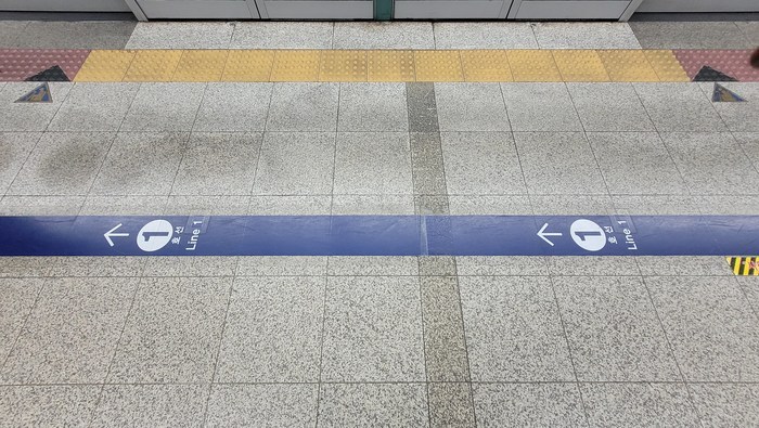 ▲ 환승편의를 위해 유도선이 설치되어 있는 6호선 동묘앞 승강장.