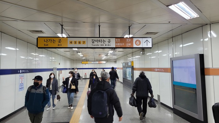 환승 유도선을 따라 이동하면 출퇴근 시간에도 어느정도 혼잡하지 않을 넓은 환승통로가 등장한다. 직선이 아닌 지그재그로 된 환승통로는 걷기에 지겹지가 않다. 특히 거리가 짧아 두 노선 간 환승시간은 기자의 걸음으로 2분 정도 소요됐다.