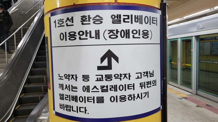 ▲ 엘리베이터 안내가 자세하게 표기된 6호선 동묘앞 승강장.
