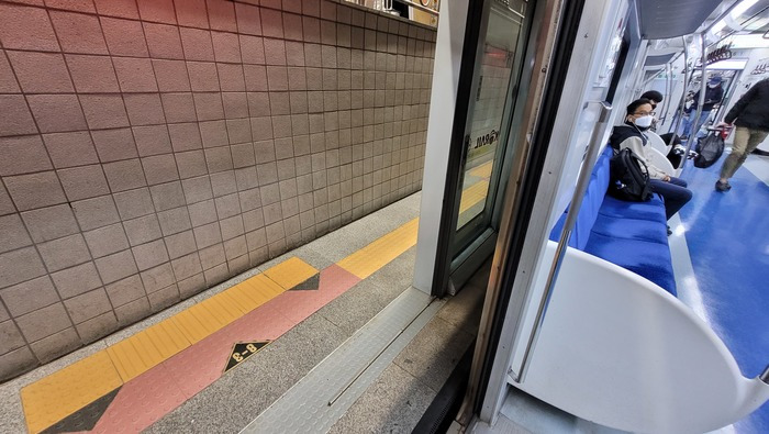 ▲ 출입문이 열리면 승객을 당황하게 만드는 좁은 폭의 승강장(열차 내에서 본 모습).