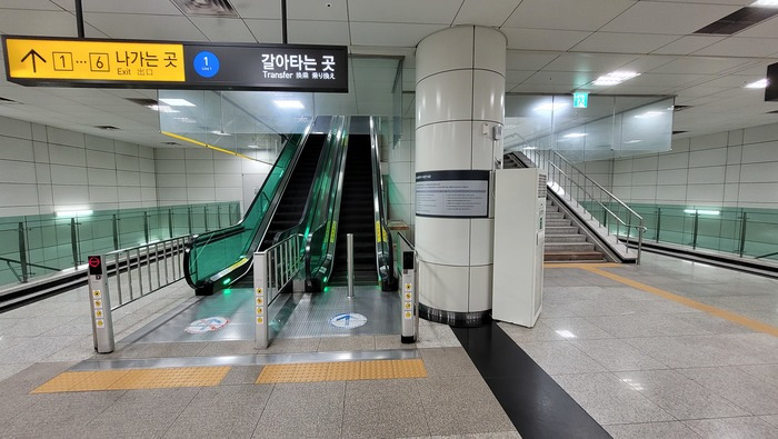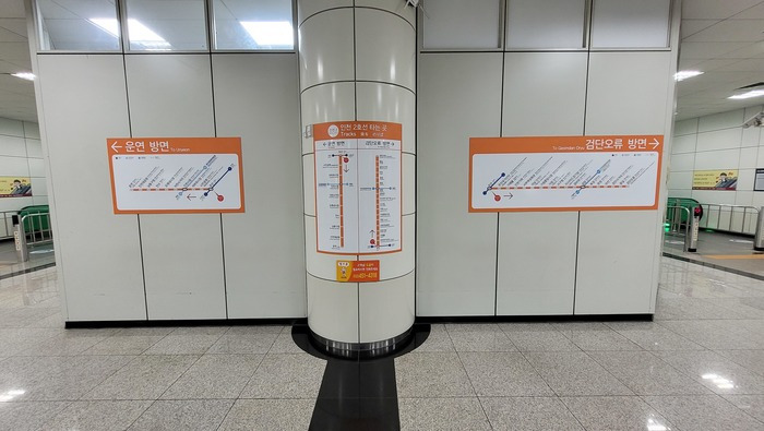 그래서 통로에는 인천 2호선 환승이 불가능하다는 안내 문구를 만날 수 있다. 글씨가 조금 더 컸으면 하는 아쉬움은 있다. 그러나 통로 측면에도 화살표로 인천 2호선 환승 방향을 유도해 놓았기 때문에 한 번 쯤은 눈에 들어오지 않을까 싶다.