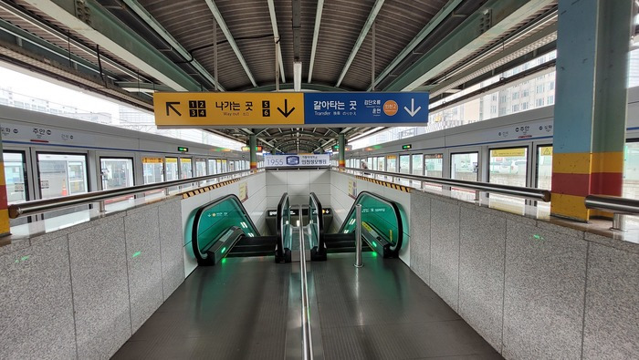 지하 환승통로는 더욱 잘 해놓아서 안내가 너무 많다는 느낌까지 받게 된다. 인천 2호선의 주요 행선지를 빼곡하게 나열해놓았기 때문에 웬만하면 반대편 열차를 잘못 탈 일이 없다. 지하 환승통로는 개통한 지 5년이 지났음에도 아직까지 새로 개통한 것처럼 세월의 흔적이 전혀 느껴지지 않는다. 그만큼 관리를 잘하고 있다는 뜻이기도 하다.
