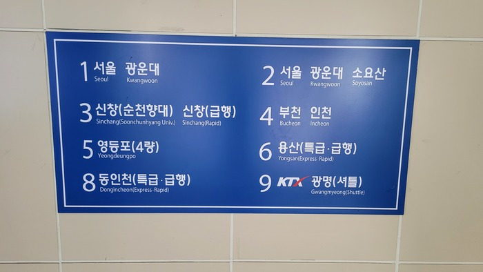 경부선 구간은 경인선 구간과의 구분을 위해 역 번호 앞에 ‘P’가 붙어있는 것을 확인할 수 있다. 이렇게 승강장이 많아진 이유는 1호선이 일반열차와 급행열차로 이원화해서 각기 다른 승강장을 사용하는 영향도 크다. 게다가 인천, 광명, 천안(신창) 방향 열차가 모두 각자의 승강장을 사용하고 있어서 시간만 잘 맞으면 여러 대의 열차가 한꺼번에 승강장으로 진입하는 모습도 볼 수 있다.
