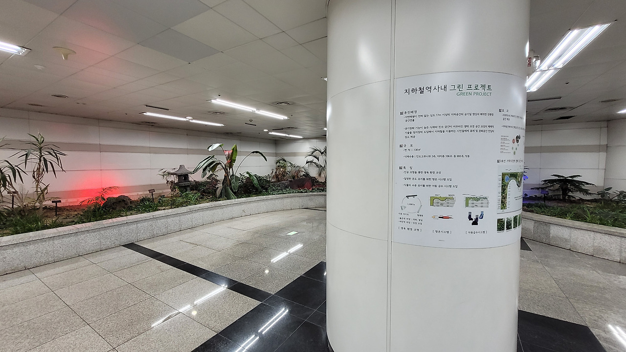8호선과 바로 이어진 환승통로에는 작지만 정원까지 꾸며놓은 것을 볼 수 있다. 최근에 만들어지는 역은 이처럼 지하 공간에도 식물을 조성해 놓아서 맑은 공기와 편안한 분위기를 연출해주고 있다. 한 가지 아쉬운 점은 너무 한 쪽 귀퉁이에 설치해놓은 관계로 발걸음이 급한 환승객들의 관심에서 벗어나 있다는 것이 아닐까 싶다.