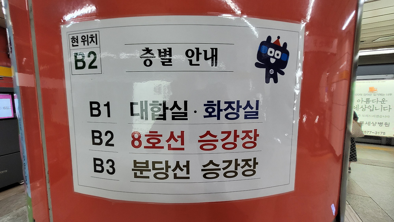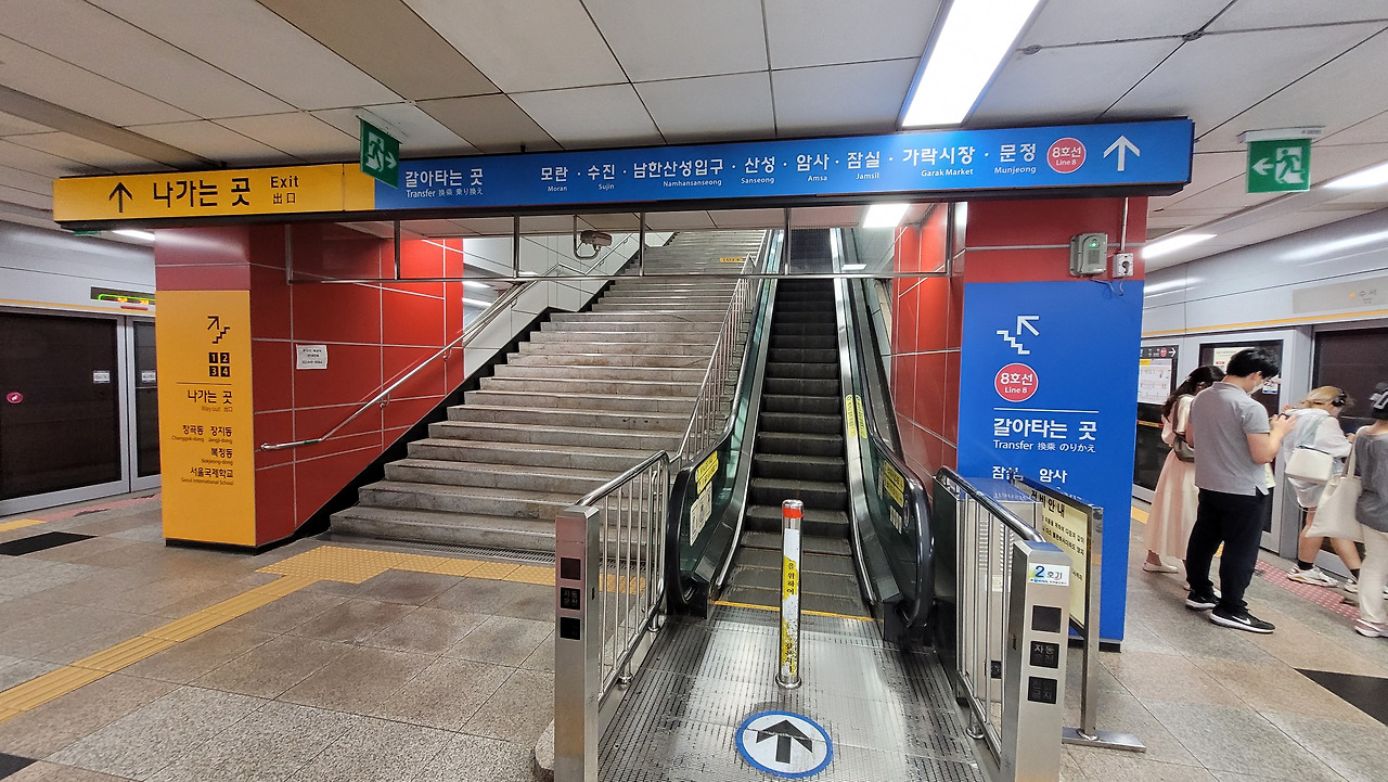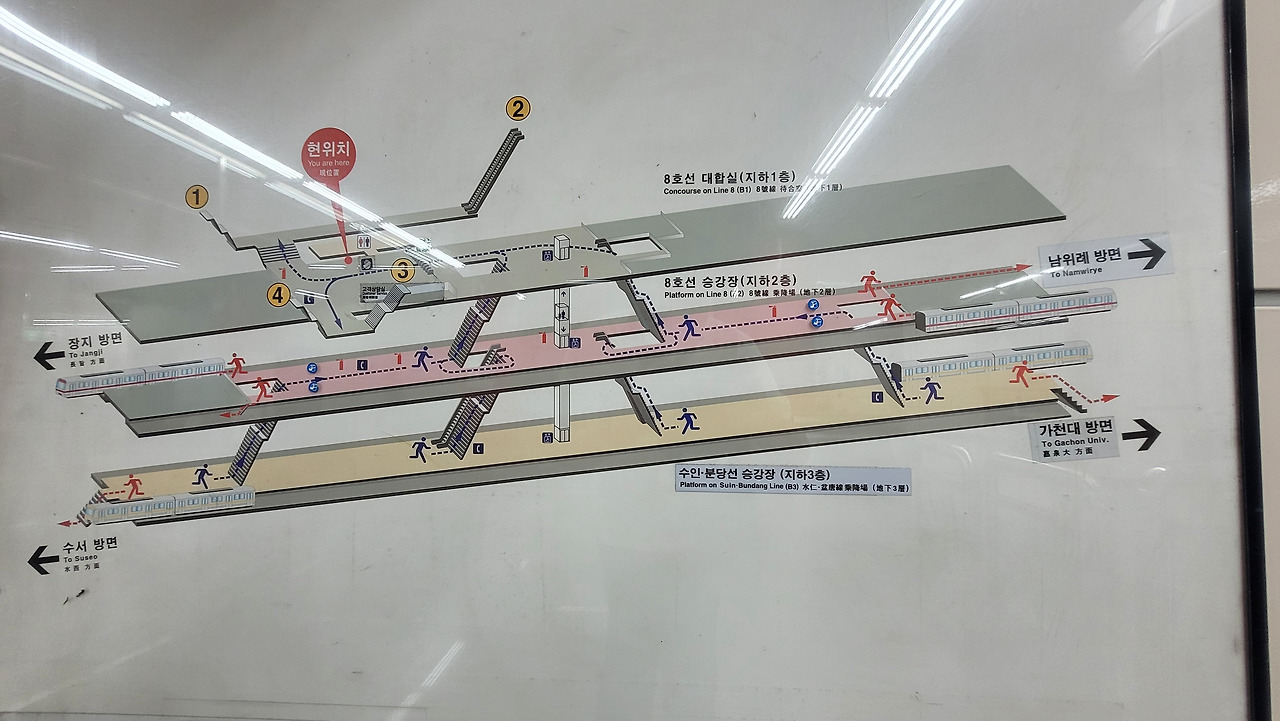 대합실과 수인분당선 사이에 위치한 8호선 승강장의 경우 대합실까지 연결하는 계단은 단 한 쌍에 불과하다. 대신 수인분당선 승강장을 연결하는 계단은 한 쌍이 더 있다.
