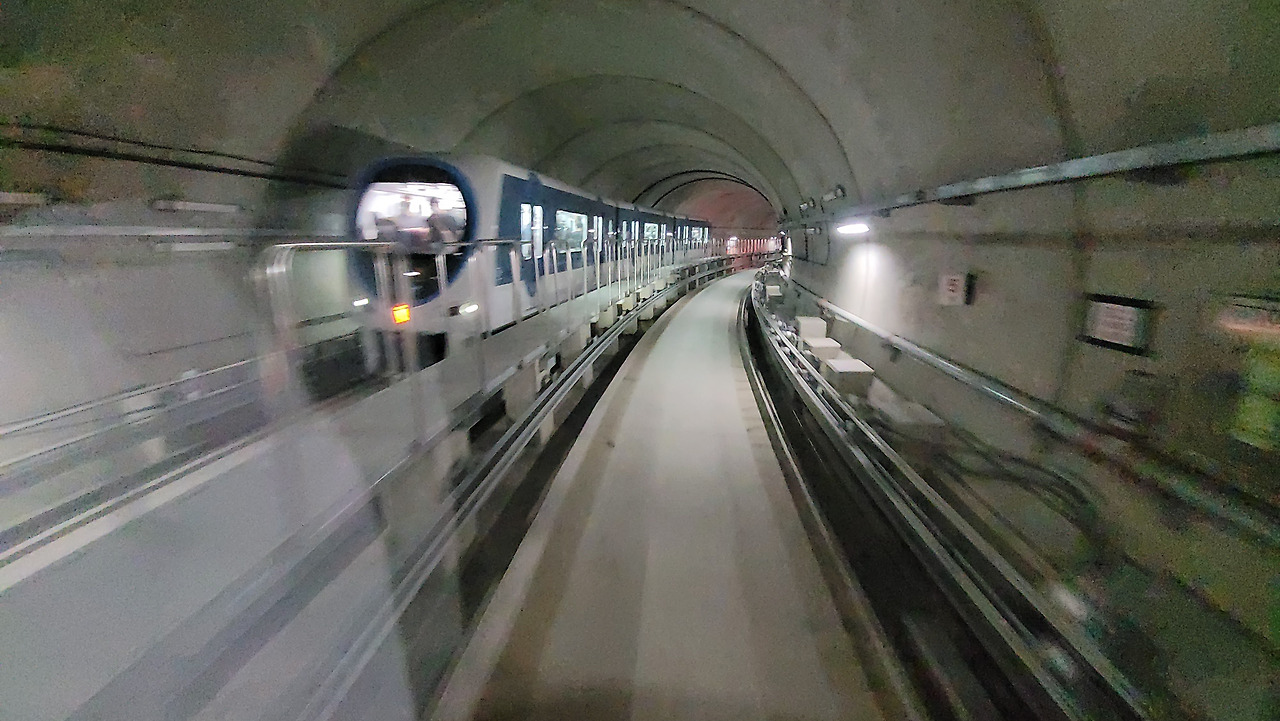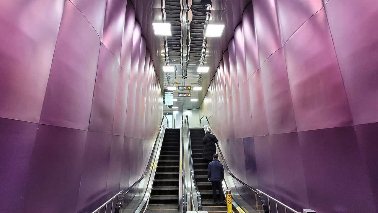같은 전면부지만 서 있는 각도에 따라 보이는 장면이 살짝 차이가 나는데, 이는 평평한 유리의 다른 경전철에서는 느낄 수 없는 차이다.