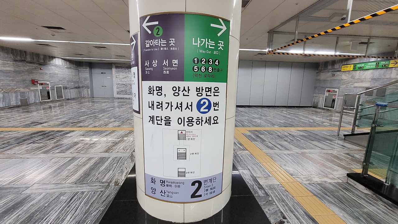 이곳도 서면역과 마찬가지로 환승통로의 연결계단에 번호가 붙어있다. 1번 계단으로 연결된 곳은 장산역 방면 승강장으로, 2번 계단으로 연결된 곳은 양산역 방면 승강장으로 각각 갈 수 있다.