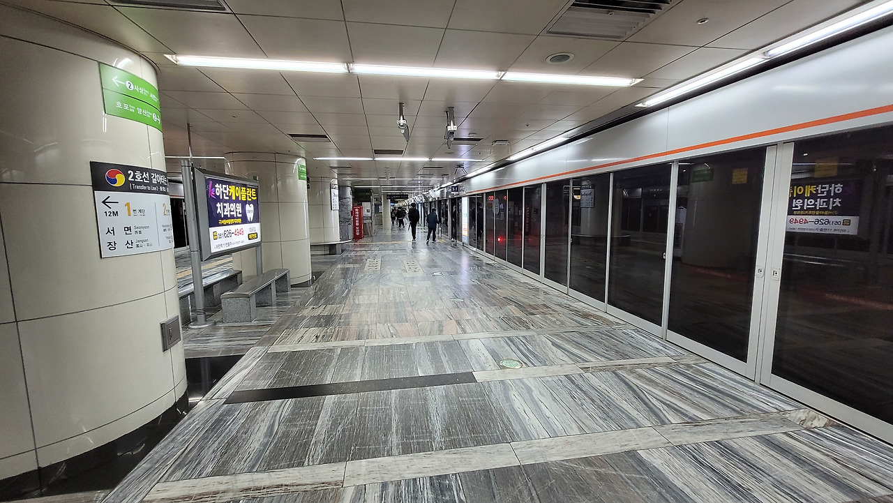 남은거리까지 상세하게 표기해놓은 2호선 승강장 환승 안내.