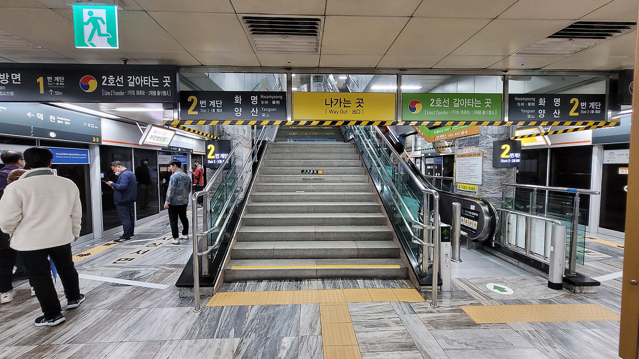 계단별로도 차이가 있는데 1번 계단은 승강장 끝에 위치해서 주어진 공간을 최대로 활용할 수 있다. 그래서 이곳에 에스컬레이터가 설치되리라 생각했다. 하지만 승강장 중간에 있어 연결통로 폭을 넓히는데 한계가 있는 2번 계단에만 에스컬레이터를 설치해놓은 상태다.