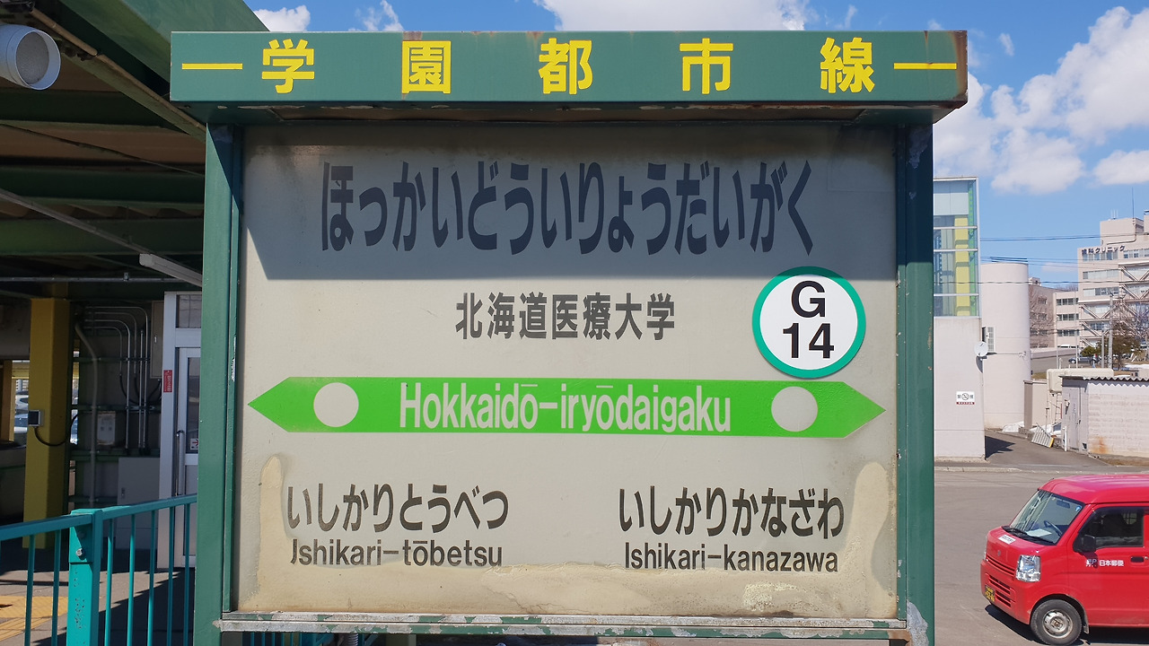 삿쇼선 북쪽 구간의 역과 남쪽 구간의 역은 또 다른 차이를 볼 수 있는데, 바로 역 번호다. 역명판을 살펴보면, 신토츠카와역에는 역 번호가 지정되어 있지 않지만, 홋카이도 의료대학역에는 G14번이라는 역 번호가 부여되어있다. 그리고 역 이름에 관계없이 역명판 위쪽에는 가쿠엔토시선이 표기된 것을 볼 수 있다. 그만큼 삿쇼선이라는 이름도 지도가 아니면 찾아볼 수가 없어 보였다.