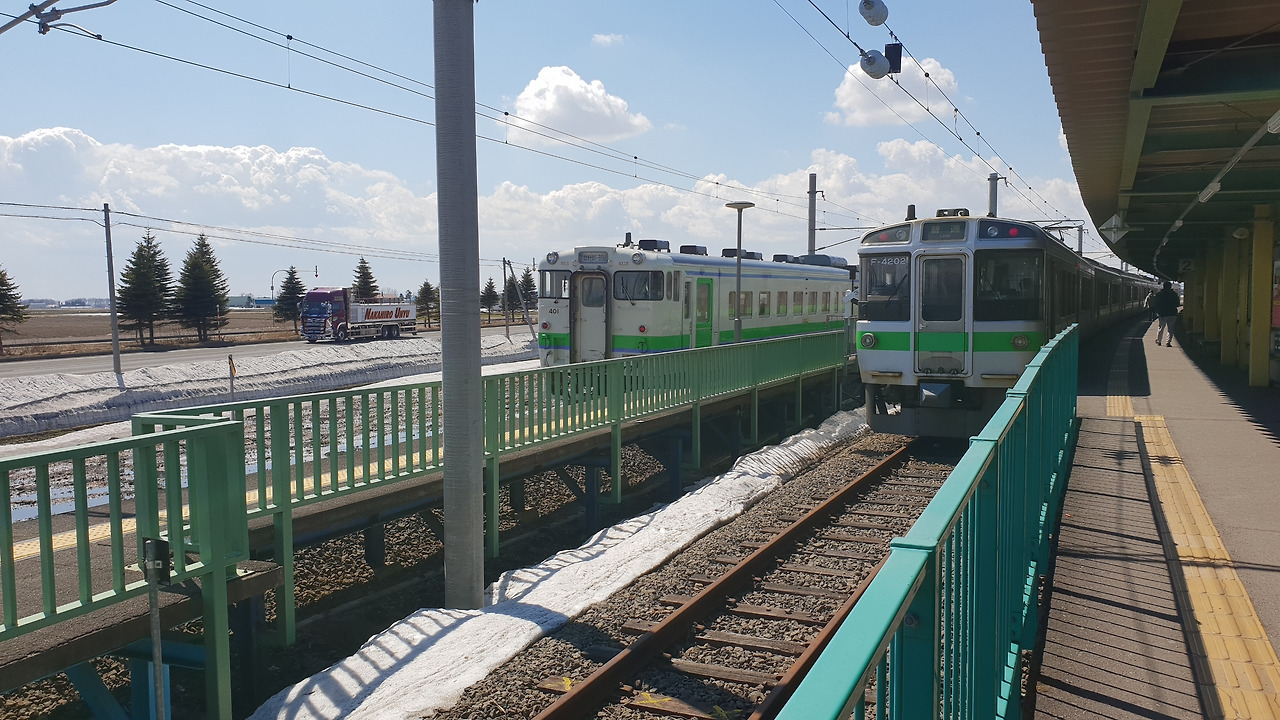 긴 열차와 같이 있는 원맨열차는 상당히 짧게 느껴진다. 저 짧은 열차의 좌석도 다 채우지 못하는 삿쇼선 북쪽 구간이 얼마나 승객이 적은 지를 다시 한번 확인하는 순간이다. 홋카이도 의료대학역부터는 6량 열차에 승객이 가득할 정도로 북쪽 구간과는 전혀 다른 풍경을 연출한다. 그래서 열차 편성이 이렇게 달라진 것으로 보인다.
