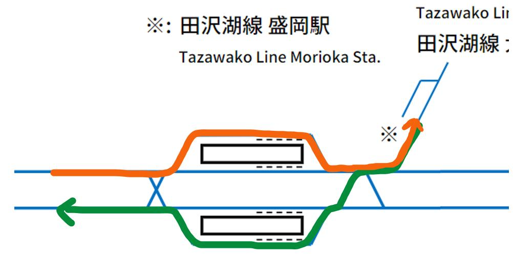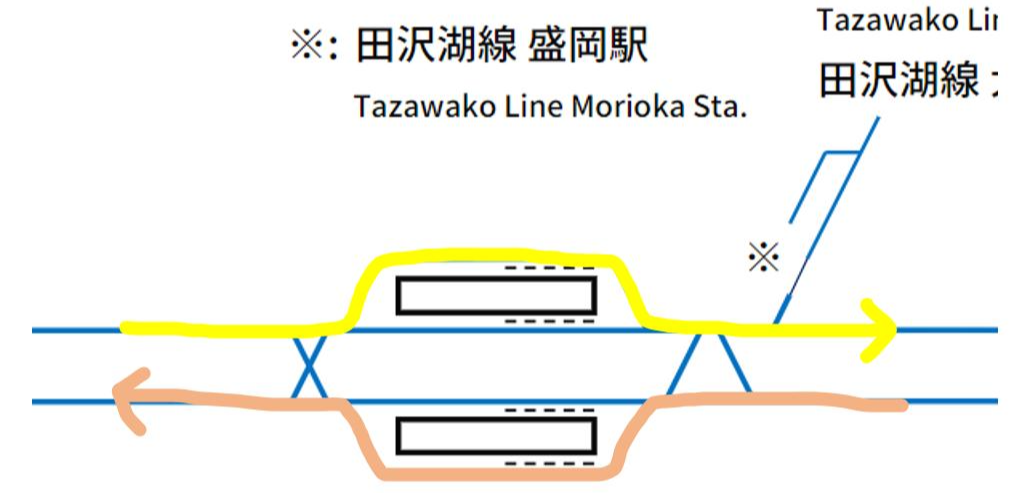 한편, 후쿠시마역과 동일한 형태의 구조를 보이는 모리오카역은 후쿠시마역과 달리 11번 승강장과 14번 승강장 모두 사용하고 있다. 일반적인 구조에서 볼 수 있는 자연스러운 형태의 승강장 모습이 바로 모리오카역이다. 하지만, 모리오카역에서 빠져나가는 아키타 신칸센 역시 야마가타 신칸센과 같이 단선 구간이기 때문에 결국 평면교차가 일어날 수밖에 없다. 후쿠시마역과는 다르지만, 일반적인 입체 분기역과는 차이가 있는 모리오카역은 어떤 구조로 되어있는지 살펴보겠다.