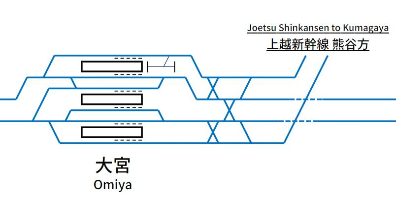 입체 분기가 이루어지는 오미야역과 다카사키역 상세 배선도(출처: https://www.haisenryakuzu.net/documents/jr/shinkansen/tohoku/)