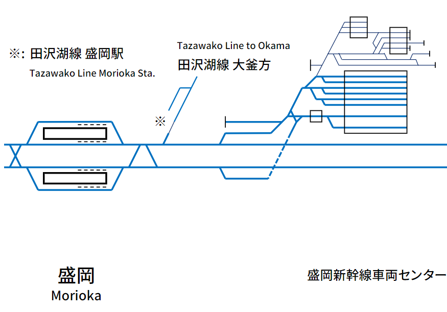 후쿠시마역과 달리 모리오카역을 통과하는 신칸센은 없기 때문에 별도의 통과 선로는 없다. 그리고 모리오카역 이북으로는 열차 빈도가 그렇게 높지 않아서 아키타 신칸센 열차를 굳이 입체교차를 하지 않아도 되었던 것으로 보인다.