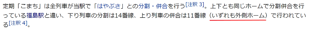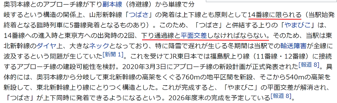 앞서 언급했던 내용은 위키백과 일본어판에서 후쿠시마역을 검색하면 나오는 내용이다. 야마가타 신칸센의 츠바사호는 오직 14번 승강장에서만 이용이 가능한데, 이 열차와 병렬연결을 하는 야마비코호는 두 번의 평면 교차를 할 수밖에 없다. 특히 눈이 많이 내려서 연착이 잦은 겨울에는 야마가타 신칸센으로 인해 도호쿠 신칸센도 큰 영향을 받음을 알 수 있다.