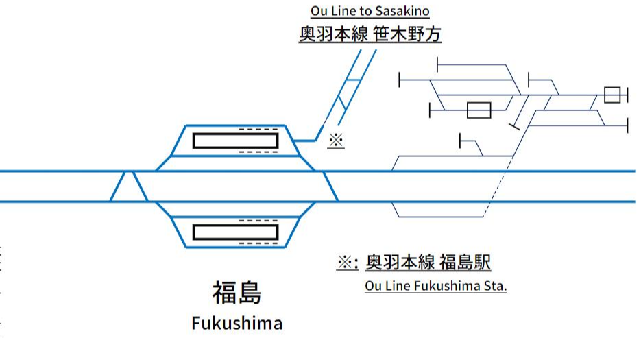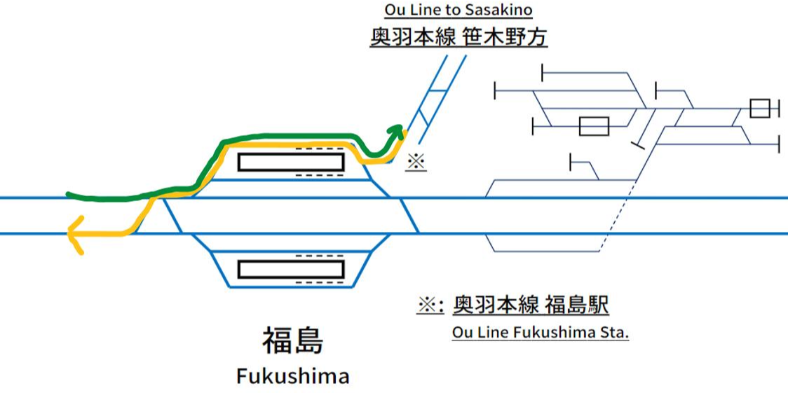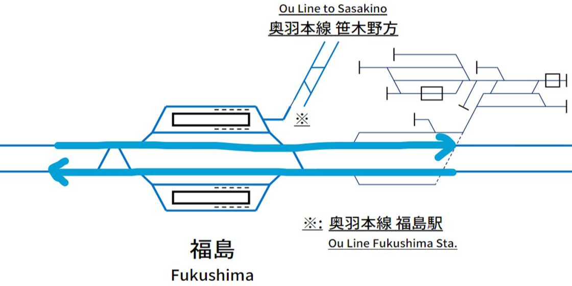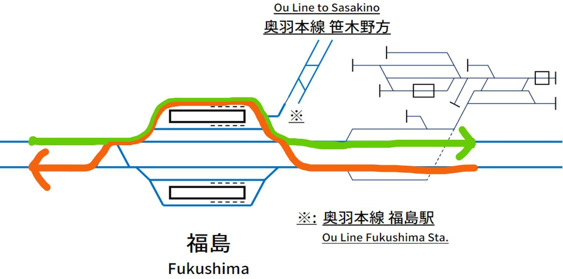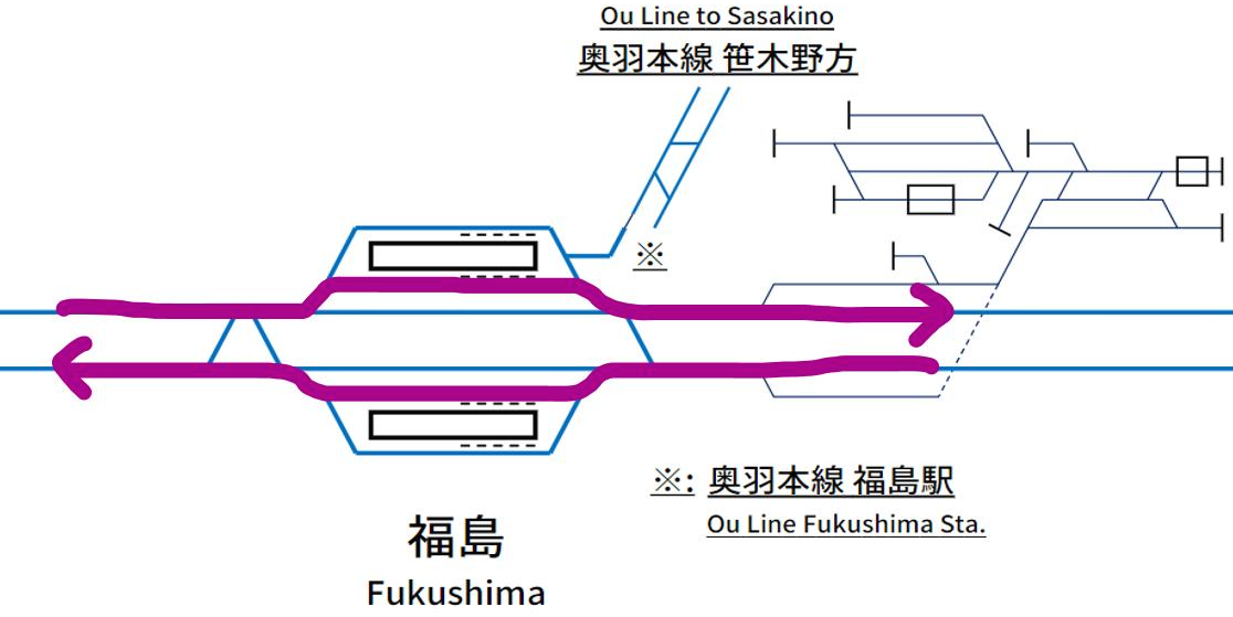 하지만 야마가타 신칸센 열차의 이동 경로를 보면 '왜 이렇게 역주행까지 하면서 운행을 해야 하는지'에 대한 답을 얻을 수 있다. 재래선 구간으로 진입함과 동시에 단선 구간으로 이어지는 야마가타 신칸센 열차에서 보면 후쿠시마역은 1선 1승강장의 형태라고 봐도 무방하다. 즉, 14번 승강장을 거치지 않으면 재래선 구간으로 진입 자체가 불가능하다.