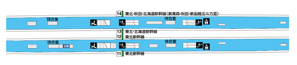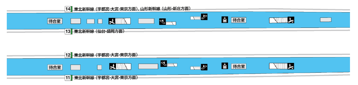 하지만 후쿠시마역과 모리오카역의 가장 큰 차이는 승강장에 정차하는 열차에 있다. 모리오카역의 경우 11, 12번 승강장은 상행선이, 13, 14번 승강장은 하행선이 사용하고 있다. 간혹 13번 승강장에서도 상행선 열차가 출발하기는 하지만, 일반적인 경우는 아니다. 그리고 미니 신칸센인 아키타 신칸센은 14번 승강장에서만 만날 수 있다.