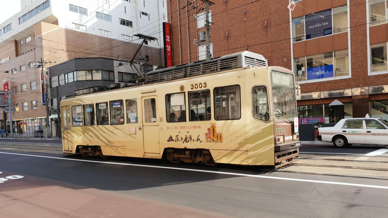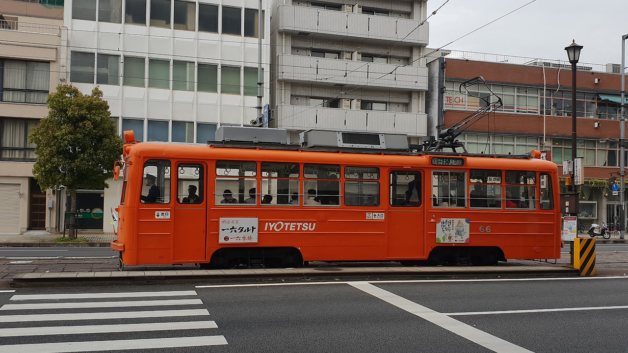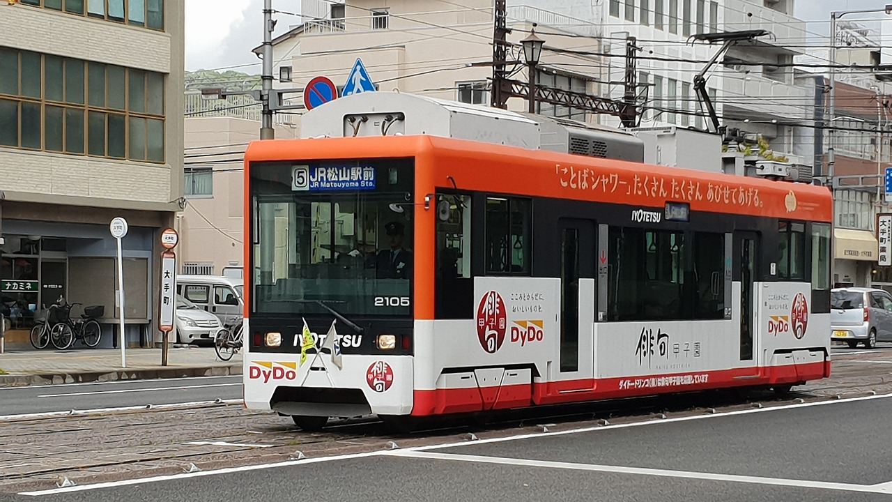 굴절 시설이 없지만 기존 열차에 비해 길어진 마츠야마 노면전차.