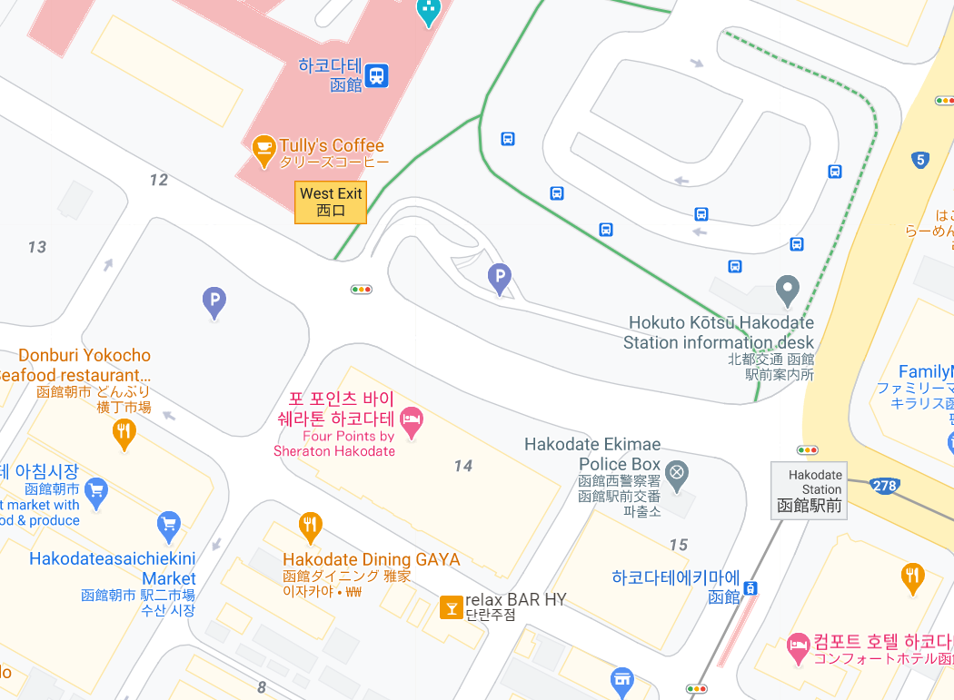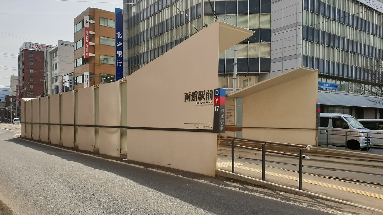 홋카이도에 자리한 하코다테 노면전차는 다른 지역의 노면전차 승강장과 달리 하코다테역 광장에서 살짝 벗어난 곳에 노면전차 승강장이 있다. 다른 지역과 달리 노면전차 하코다테역은 종착역이 아닌 중간역인데도 불구하고 하코다테역에서도 잘 보일 정도로 규모가 제법 크다. 비록 역에서 조금 떨어져 있어도 JR역이 노면전차 승객에 미치는 영향이 어느 정도인지 알 수 있는 장면이다.