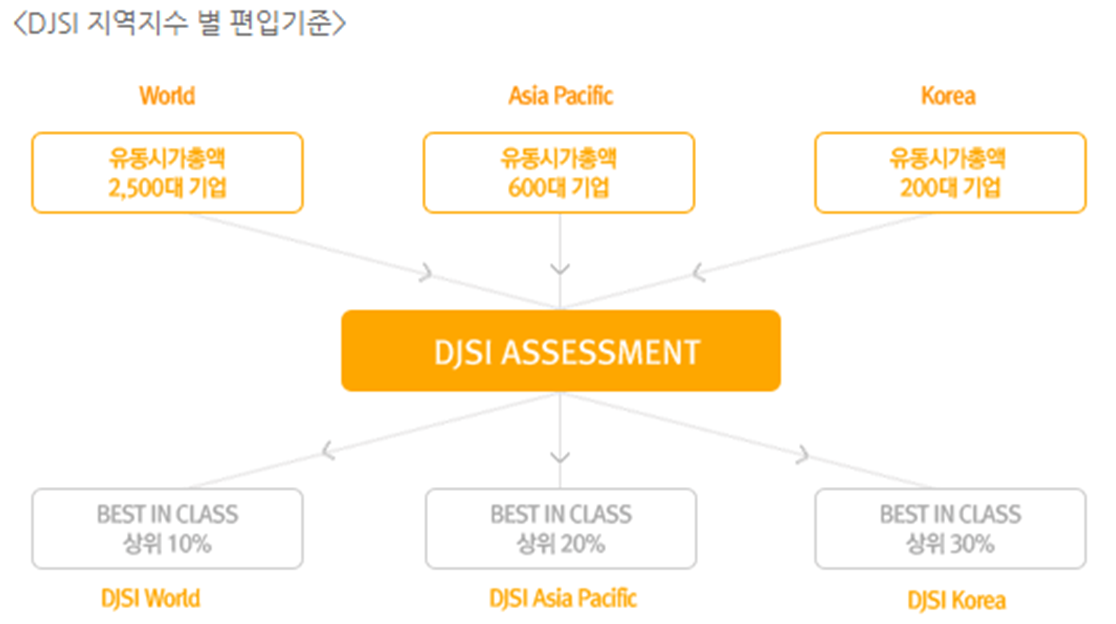 DJSI는 전 세계 2,500여 개 시가총액 상위 기업을 대상으로 평가를 진행하며, 각 국가마다 로컬 파트너를 선정하여 함께 평가한다. 한국에서는 한국생산성본부가 로컬 파트너로 지정되어 있어, 한국 단위의 ESG 평가인 국가 단위 다우존스 경영지수, DJSI Korea를 통해 국내 기업을 평가한다.
