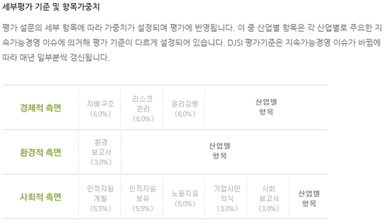 DJSI의 평가 설문은 공통 항목과 산업별 항목으로 나누어 구성되고, 환경, 사회, 지배구조+경제의 각 영역에서 산업별 항목 설문의 비중이 다르다. 평가 항목의 세부 항목에 따라 가중치도 다르게 설정되어 평가에 반영된다.