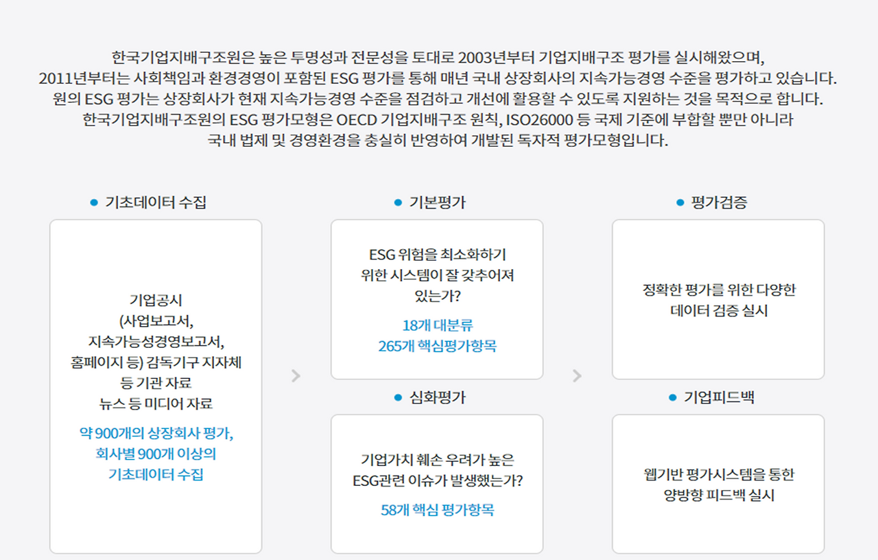 KCGS는 기업들에게 바람직한 지배 구조를 제시하고 지속가능한 경영을 지원한다는 목적으로 2002년에 설립되었다. 2003년 기업지배구조 평가를 시작하였으며, 2011년에는 평가 항목에 사회책임과 환경경영을 포함하면서 ESG 평가를 실시하게 되었다.