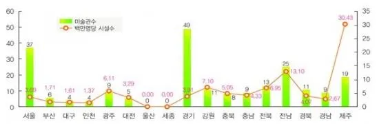 경기도, 서울, 제주도에 가장 많은 미술관이 있다. 그러나 미술관의 증가가 인구수 대비 증가한 것은 아니다. 인구 백만 명당 시설은 지방이 수도권보다 많았다.