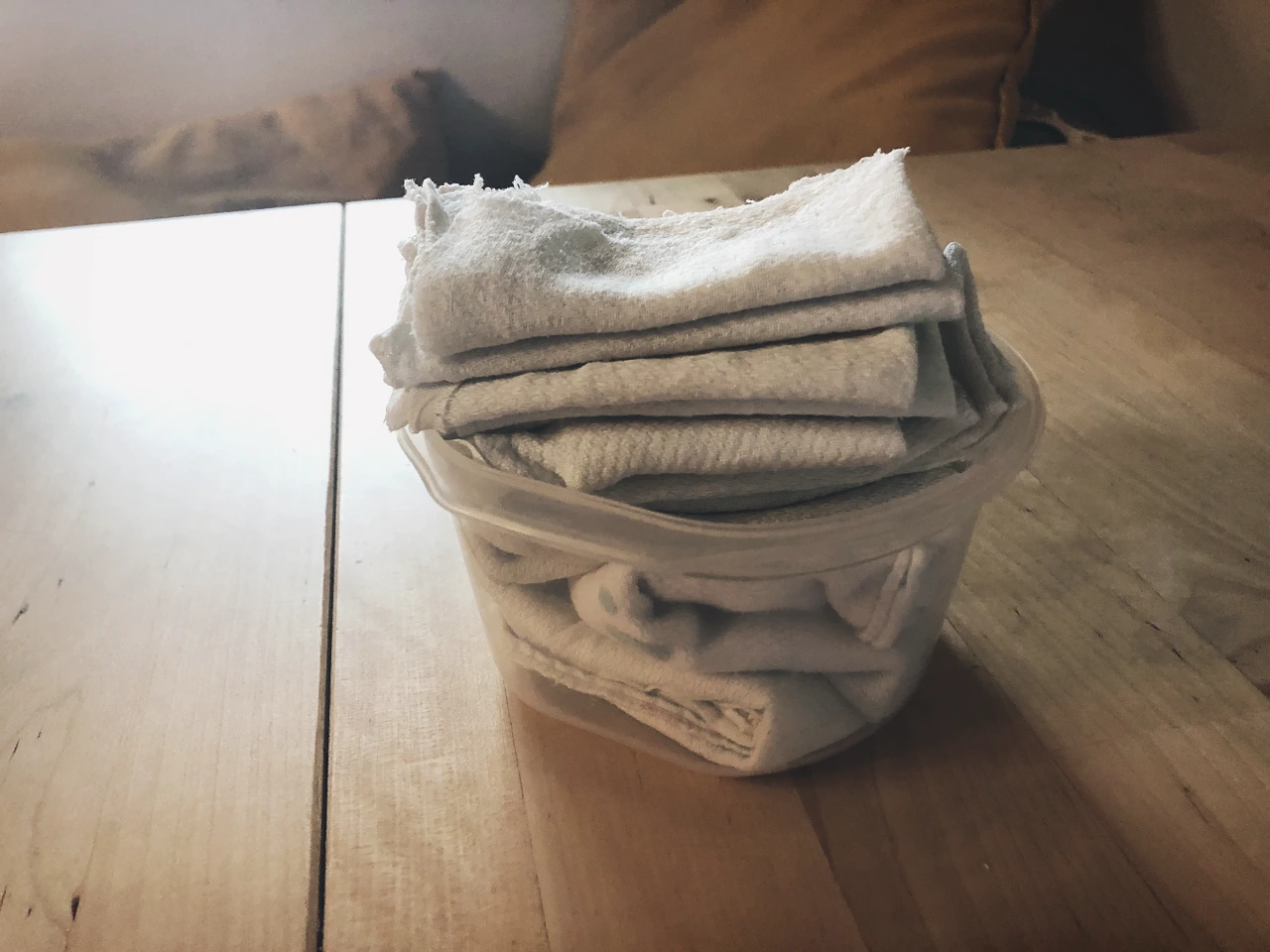 아이를 키우면서 특히나 물티슈 없이 못 살 줄 알았는데, 물을 그때그때 묻혀야 하는 순면 건티슈를 한동안 사용하다가 최종적으로 그마저 내려놓고 현재는 식탁 위에 모아 놓은 천 조각들을 사용하고 있다.