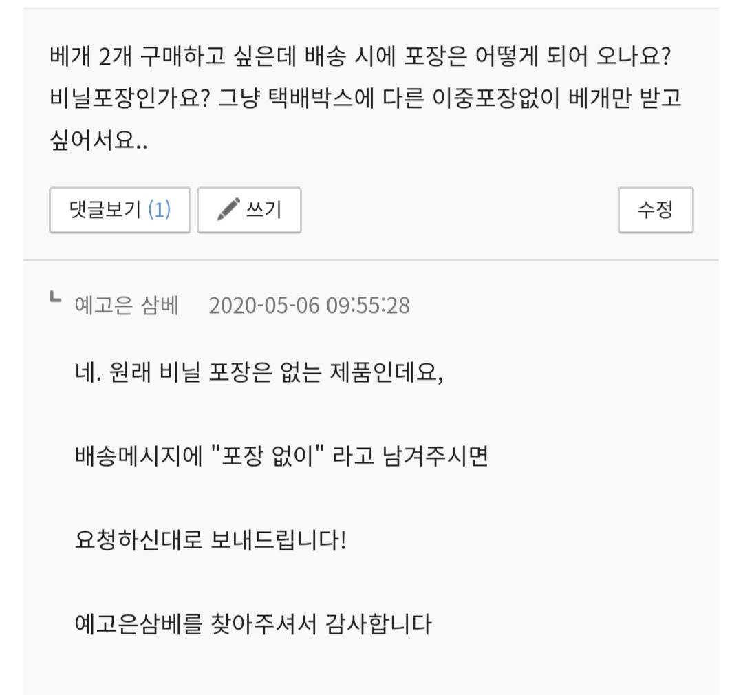 실제로 문의하려고 다른 소비자들이 달아 놓은 글을 훑어보다가 나처럼 비닐이나 플라스틱 포장을 빼고 보내달라는 요청 글을 가끔 발견하곤 한다. 포장 관련 문의로 판매자를 귀찮게 하는 소비자가 곳곳에 있다는 것을 알게 되었을 때의 그 희열이란!