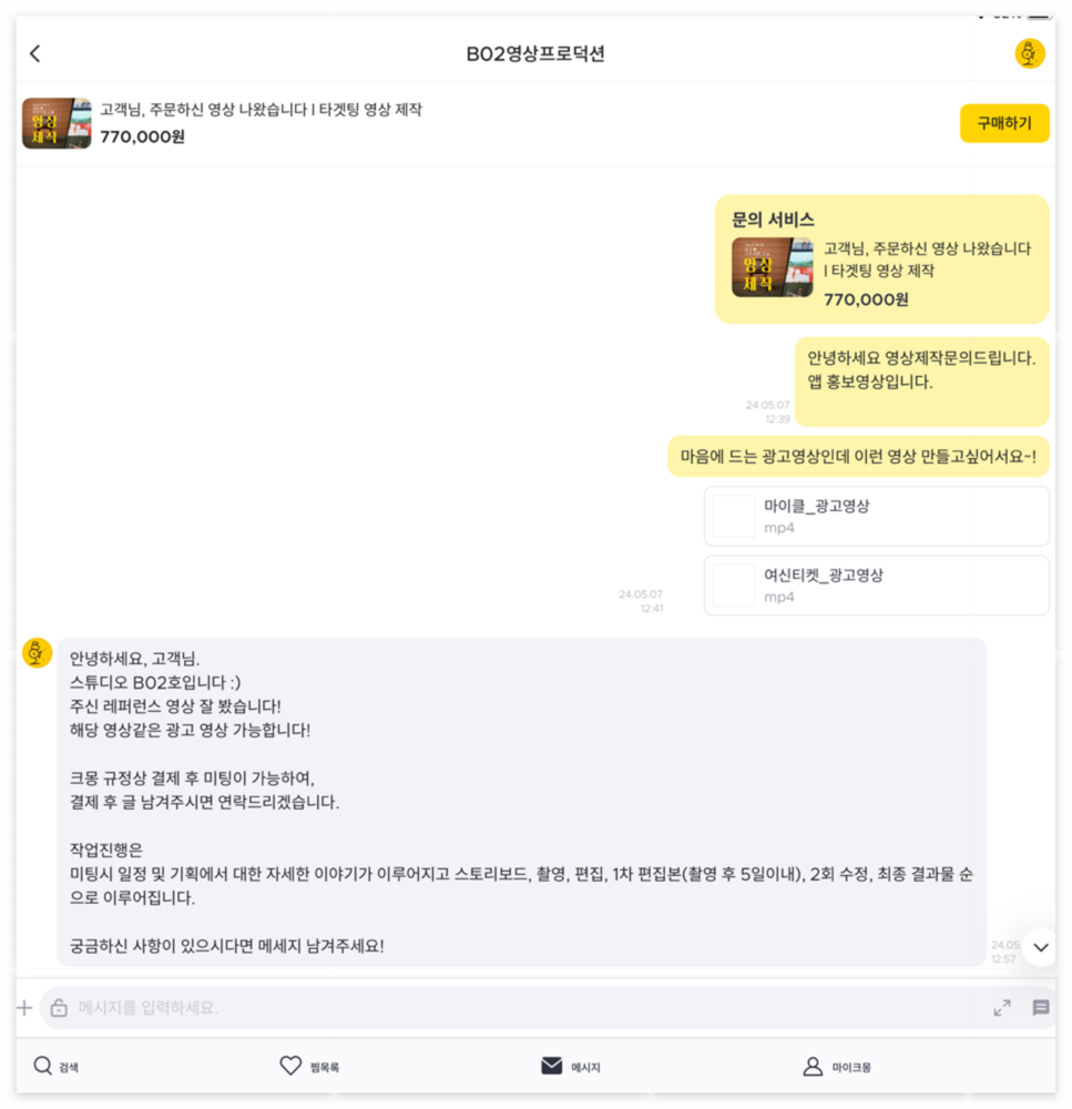 이런식으로 먼저 우리가 원하는 형태의 영상을 명확하게 전달할 수 있는 방식으로 문의를 넣었습니다.