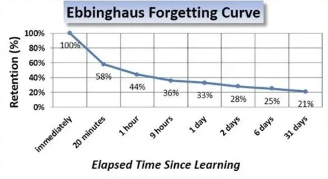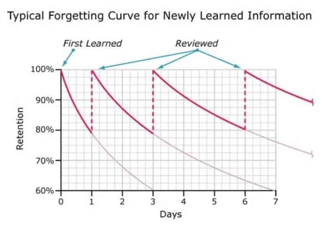 첫번째 그래프가 에빙하우스 망각 커브다. 20분 뒤에 거의 절반이 잊힌다. 그렇다. 내 뇌는 생각보다 믿음직스럽지 못했다. 해결법이 두번째 그래프에 나온다. 특정 간격을 두고 복습하면 지식이 처음처럼 회귀한다.