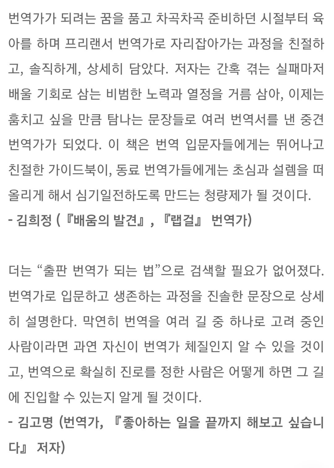 고민고민 끝에, 늘 아낌없이 조언해주시는 번역가 김희정 선생님과, 번역가의 습관이라는 주제로 저서를 출간하신 경험이 있어 제 마음을 잘 알아주실 것 같은 김고명 번역가님께 조심스레 부탁을 드렸습니다. 정말 감사하게도 두 분 다 흔쾌히 오케이 해주셨고, 바쁜 일정을 쪼개고 쪼개어 첫 독자로서 제 글을 읽어주시고 과분한 말씀도 많이 해주셨습니다.