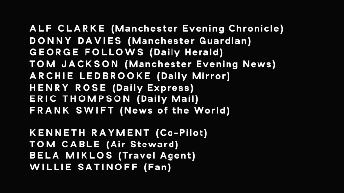 이 참사로 인하여 총 23명의 희생자가 발생하였는데, 그중 맨체스터 선수들이 8명, 맨체스터 구단 스탭 3명이 희생당하였고, 기자진들은 알프 클락을 비롯하여 총 8명이 희생당하였다. 또한 그 외 승무원이나 여행 대행사 직원들을 비롯하여 총 4명이 희생당하였다. 그 외 생존한 사람들 중에서 맨체스터 유나이티드의 조니 베리와 제키 블렌치 플라워는 사고 후의 후유증으로 인하여 축구장을 떠나게 되었다.