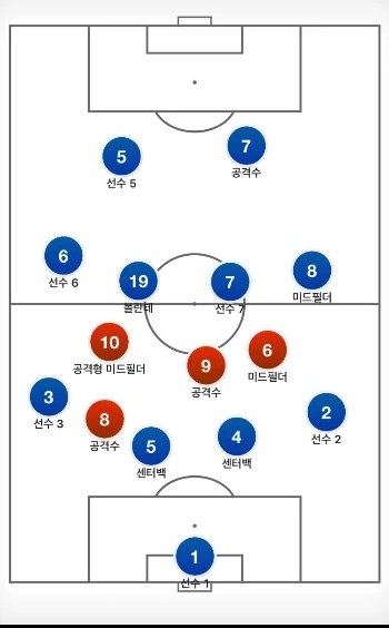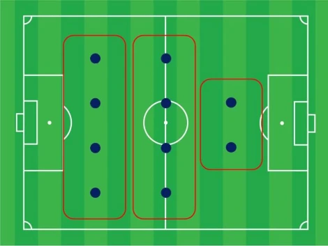 다음 그림을 통하여 지역방어의 개념을 좀더 자세히 익혀보자. 다음 그림은 선수들이 4-4-2 포메이션을 취하고 있는 그림이다. 여기서 4-4-2포메이션은 지역방어를 하기에 가장 적합한 포메이션이라고 할 수 있는데, 이는 그림에서 추론할 수 있듯이 팀원 전체가 필드 전체를 등분하여 각자 균등한 공간을 가지고 수비할 수 있기 때문이다. 그러나 두명의 공격수는 수비수보다 상대적으로 수비에 치중하지 않는다. 공격수는 자신의 지역에서 상대방의 볼을 탈취하는데 도움을 주는 압박(pressing)을 한다. 실질적으로 수비 전술이 이루어지는 구역은 미드필더부터 시작된다.