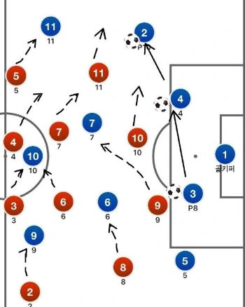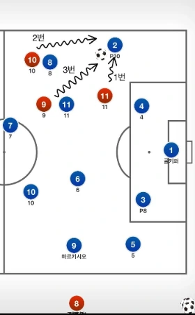 먼저 압박의 예시 1번과 마찬가지로 빨간 팀의 최전방선수가 압박을 통하여 상대방을 측면 구역으로 몰아세우는 데 성공하였다. 그 다음 빨간 팀이 전개해야 될 압박의 방식은 이러하다. 1. 먼저 최전방 공격수(빨간색 11번)는 상대방이 자신의 센터백으로 패스를 하는것을 차단하는 포지션을 잡아야 한다.(프레싱존을 벗어나지 못하게 하기)그리고 빨간 팀의 왼쪽 미드필더(10번)는 2. 볼을 소유한 상대가 횡적 드리블(중앙쪽으로의 움직임)을 하지 않게끔 적당한 거리를 유지하면서 마크한다. 그 다음 이때 빨간 팀 중앙 미드필더(9번)과 풀백(8번)은 왼쪽 미드필더(10번)과 함께 거리를 좁히면서 상대가 패스를 뿌릴 수 있는 코스와 공간을 좁혀나간다.
