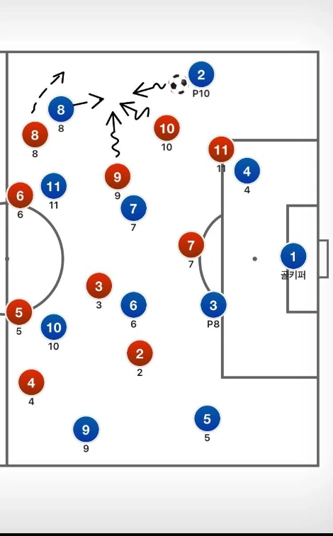 만약 이때 상대 풀백이 상대 윙어(11번)에게 패스를 성공할 경우, 더욱 압박의 강도를 높힐 필요가 있다. 이때 볼을 잡은 상대 11번이 중앙으로 드리블해오면,빨간 팀은 빠르게 세명의 선수(2번,10번,8번)가 세방향으로 11번을 에워쌓여야 한다. 여기서 핵심은 상대가 압박으로부터 탈출하지 못하게 공간을 극도로 줄이는 것이다. 그다음, 적절한 시기에 수비수를 시작으로, 순차적으로 볼을 탈취하는 움직임을 보여야 한다.