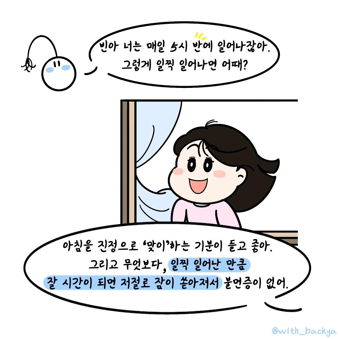 빈아_아침을 진정으로 '맞이'하는 기분이 들고 좋아. 그리고 무엇보다, 일찍 일어난 만큼 잘 시간이 되면 저절로 잠이 쏟아져서 불면증이 없어.