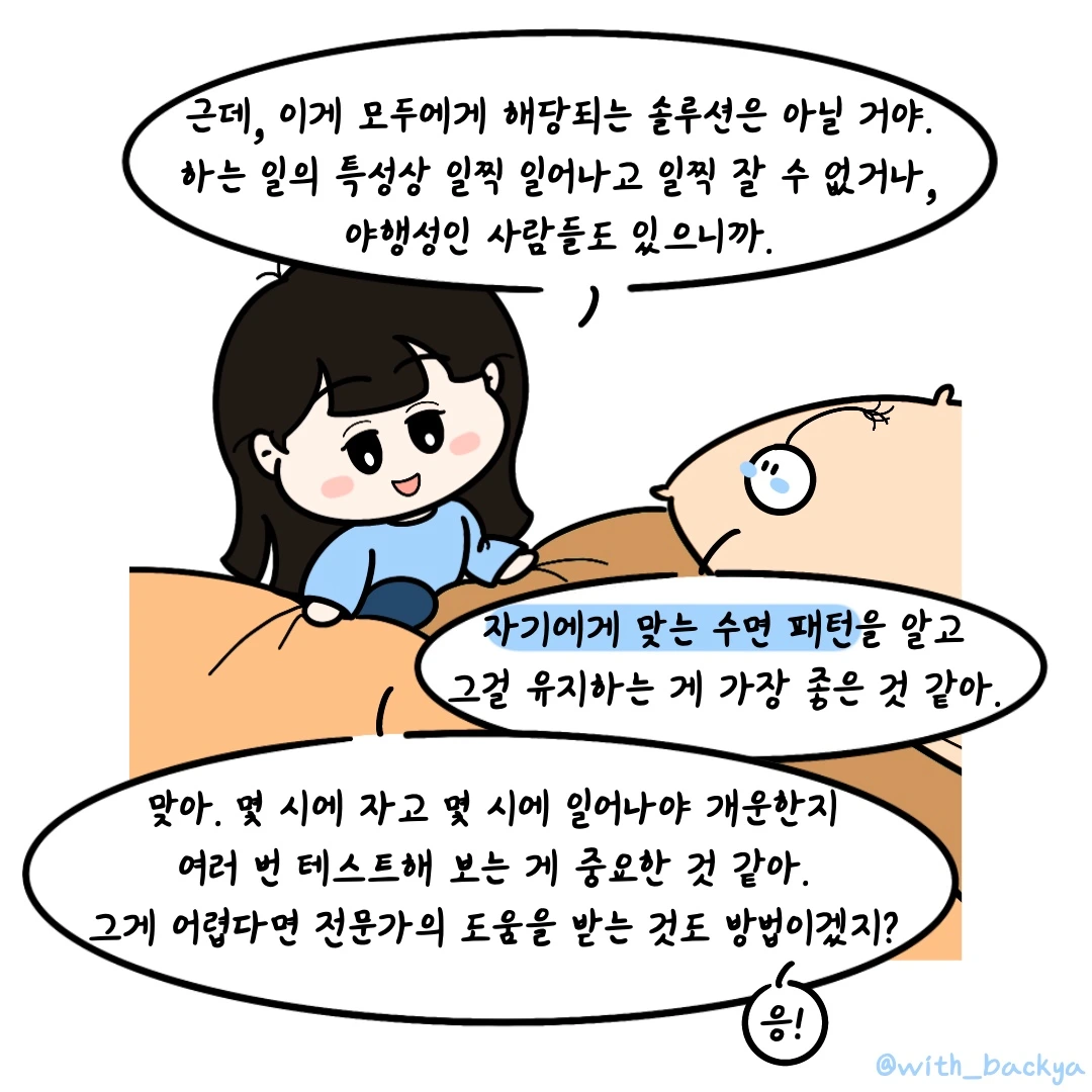 빈아_근데, 이게 모두에게 해당되는 솔루션은 아닐 거야. 하는 일의 특성상 일찍 일어나고 일찍 잘 수 없거나, 야행성인 사람들도 있으니까.