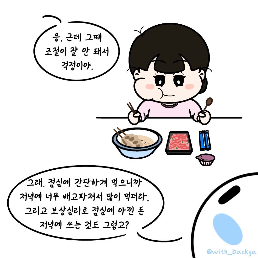 백야_그래. 점심에 간단하게 먹으니까 저녁에 너무 배고파져서 많이 먹더라. 그리고 보상심리로 점심에 아낀 돈 저녁에 쓰는 것도 그렇고?