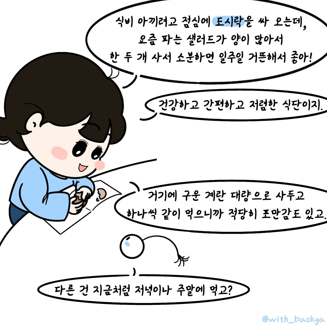 빈아_식비 아끼려고 점심에 도시락을 싸 오는데, 요즘 파는 샐러드가 양이 많아서 한 두 개 사서 소분하면 일주일 거뜬해서 좋아! 건강하고 간편하고 저렴한 식단이지. 거기에 구운 계란 대량으로 사두고 하나씩 같이 먹으니까 적당히 포만감도 있고.