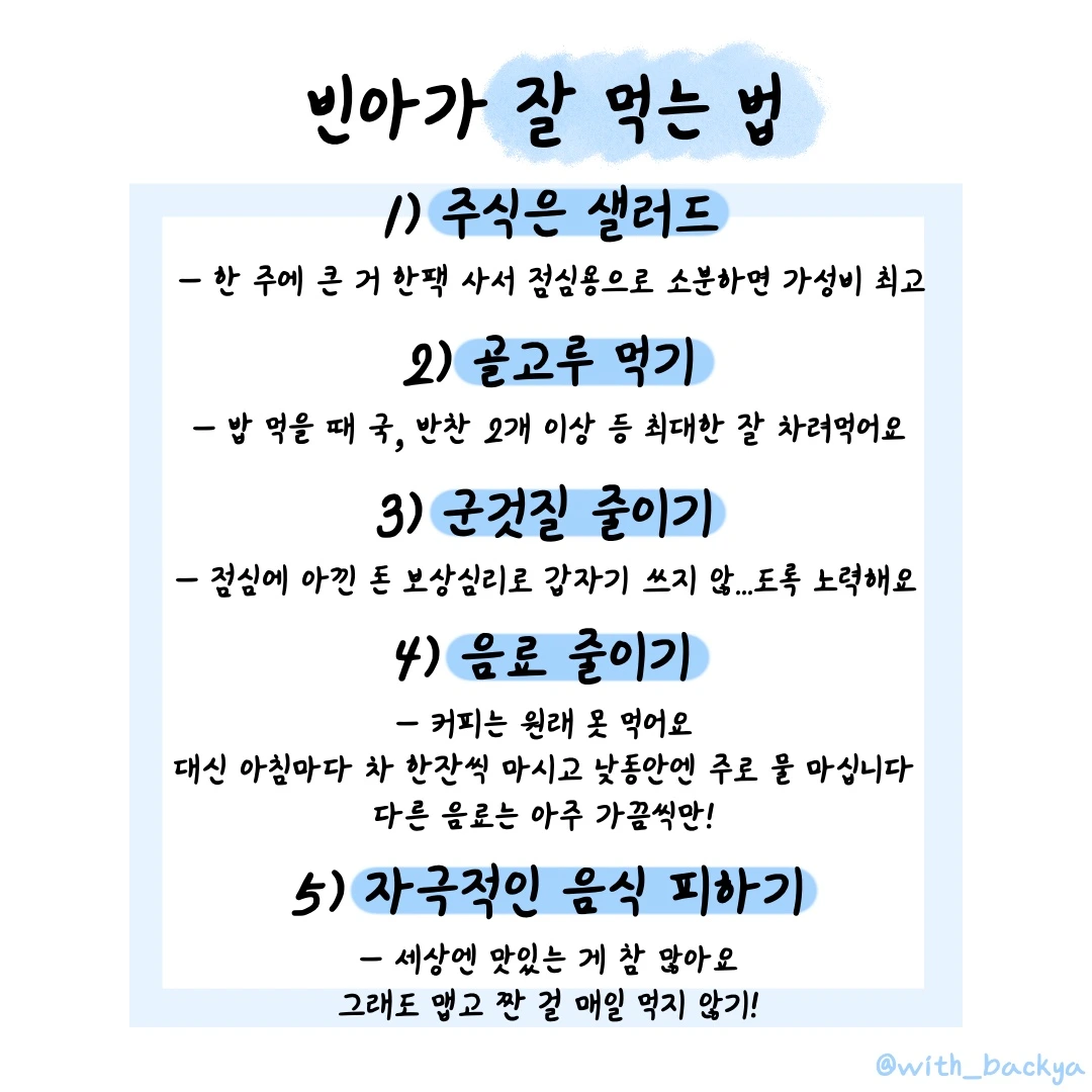 5) 자극적인 음식 피하기 - 세상엔 맛있는 게 참 많아요. 그래도 맵고 짠 걸 매일 먹지 않기!