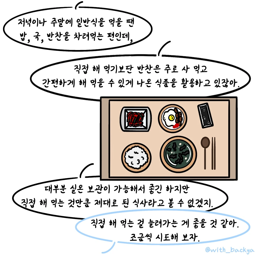 백야_직접 해 먹는 걸 늘려가는 게 좋을 것 같아. 조금씩 시도해 보자.