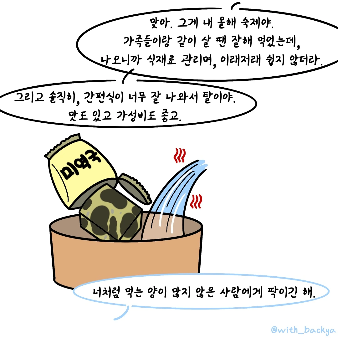 빈아_맞아. 그게 내 올해 숙제야. 가족들이랑 같이 살 땐 잘해 먹었는데, 나오니까 식재료 관리며, 이래저래 쉽지 않더라. 그리고 솔직히, 간편식이 너무 잘 나와서 탈이야. 맛도 있고 가성비도 좋고.