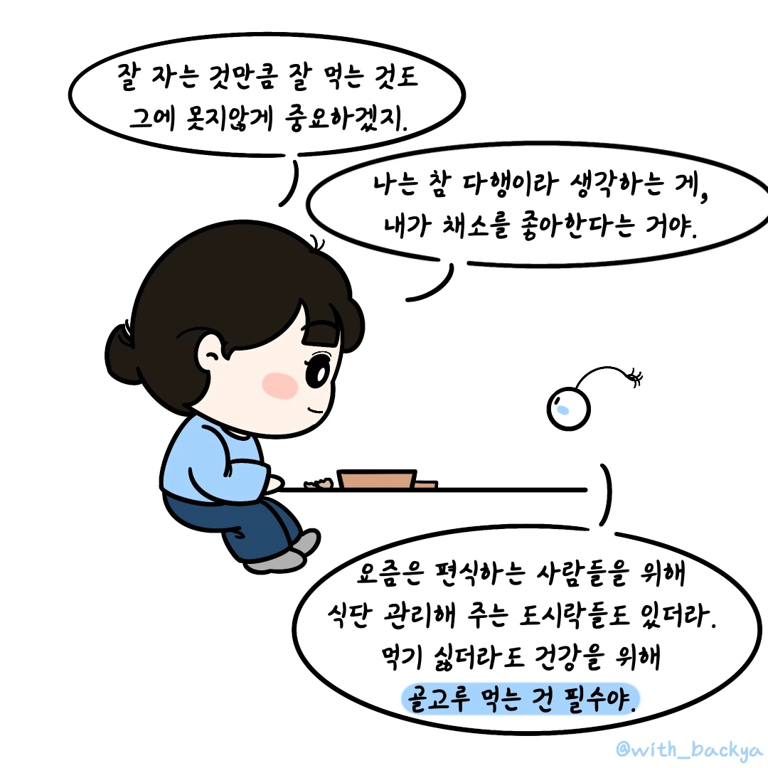 백야_요즘은 편식하는 사람들을 위해 식단 관리해 주는 도시락들도 있더라. 먹기 싫더라도 건강을 위해 건강한 식단은 필수야.