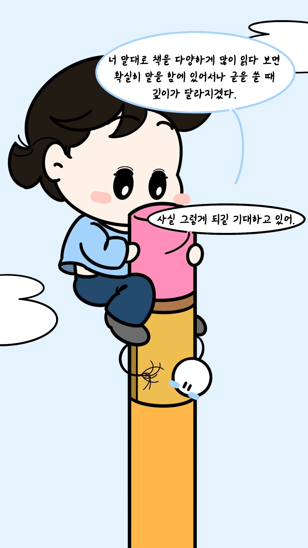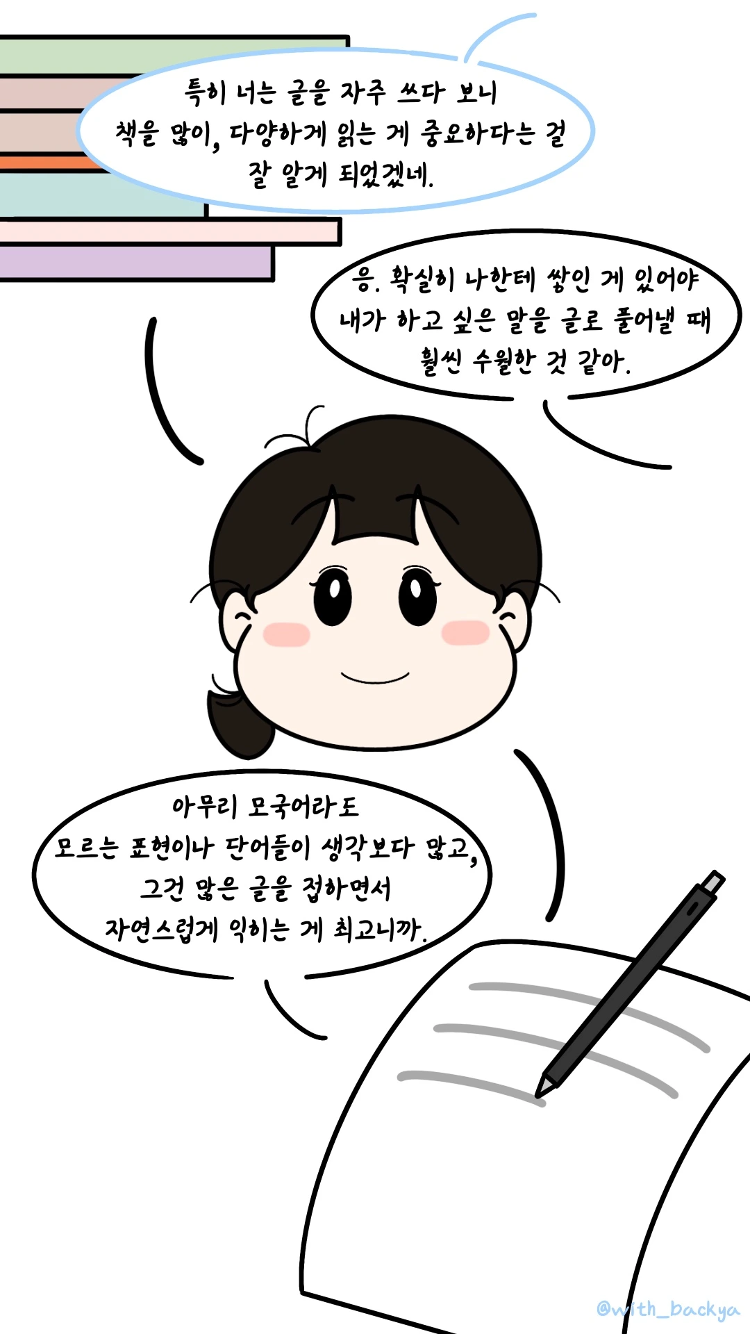 빈아_응. 확실히 나한테 쌓인 게 있어야 내가 하고 싶은 말을 글로 풀어낼 때 훨씬 수월한 것 같아. 아무리 모국어라도 모르는 표현이나 단어들이 생각보다 많고, 그건 많은 글을 접하면서 자연스럽게 익히는 게 최고니까.