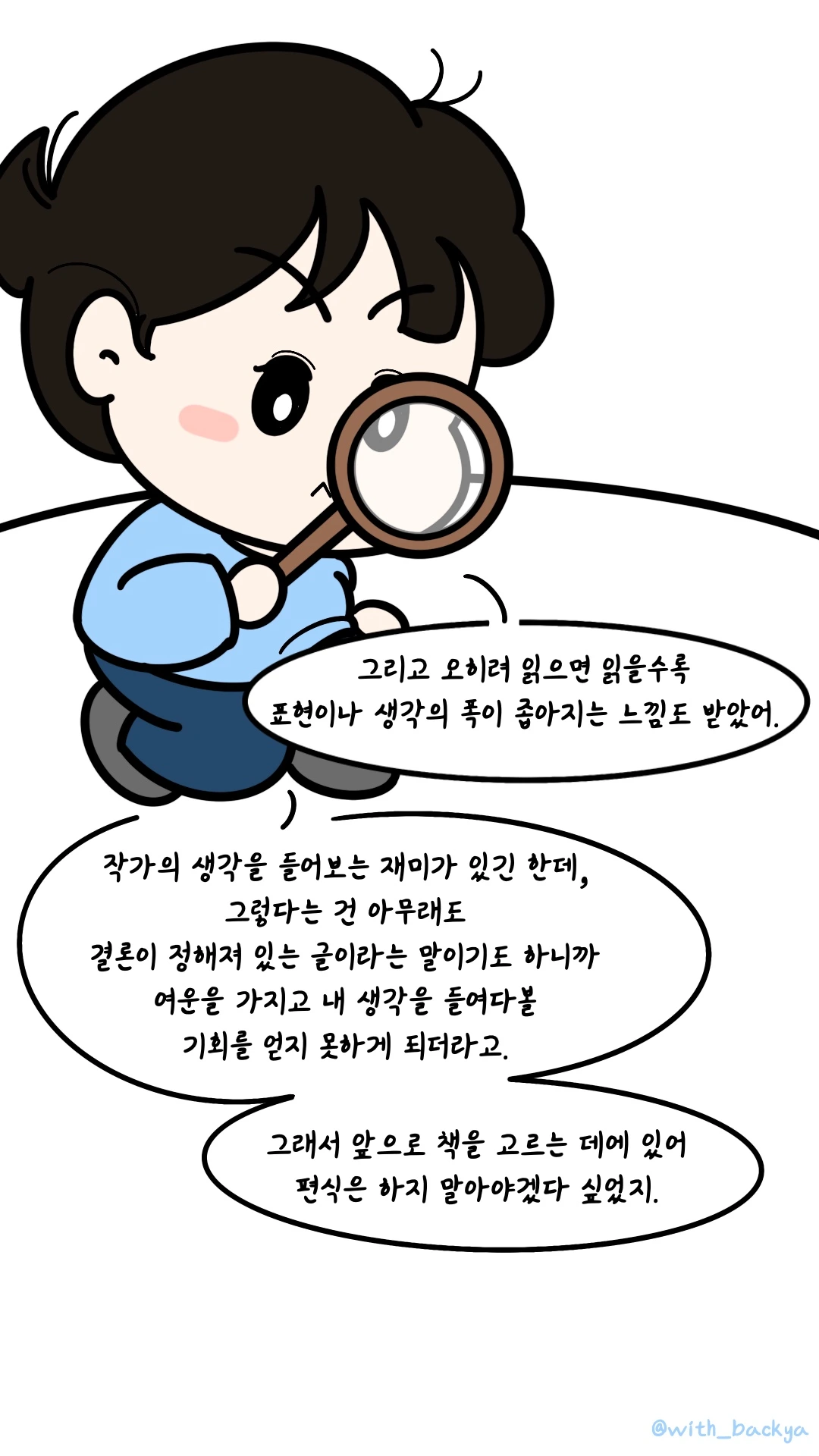빈아_그리고 오히려 읽으면 읽을수록 표현이나 생각의 폭이 좁아지는 느낌도 받았어. 작가의 생각을 들어보는 재미가 있긴 한데, 그렇다는 건 아무래도 결론이 정해져 있는 글이라는 말이기도 하니까 여운을 가지고 내 생각을 들여다볼 기회를 얻지 못하게 되더라고. 그래서 앞으로 책을 고르는 데에 있어 편식은 하지 말아야겠다 싶었지.
