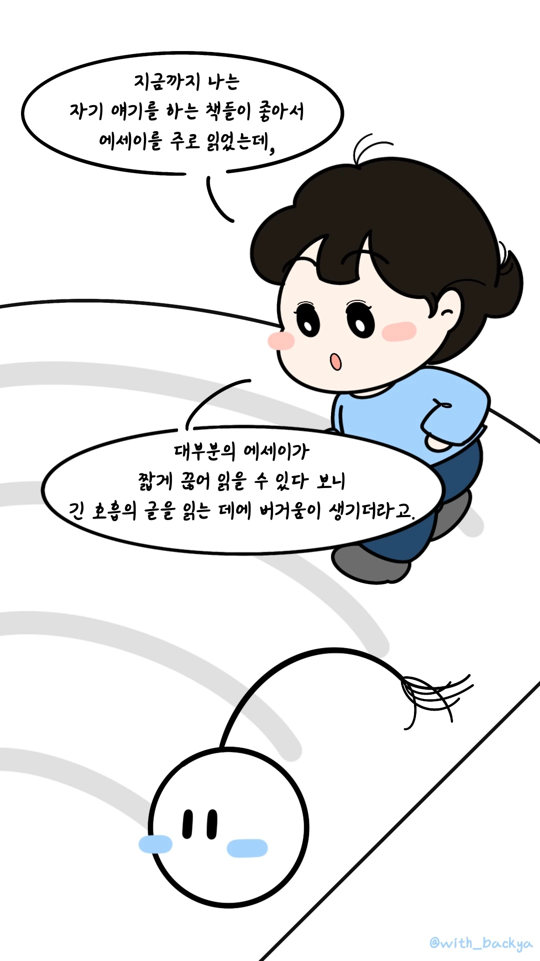 빈아_지금까지 나는 자기 얘기를 하는 책들이 좋아서 에세이를 주로 읽었는데, 대부분의 에세이가 짧게 끊어 읽을 수 있다 보니 긴 호흡의 글을 읽는 데에 버거움이 생기더라고.