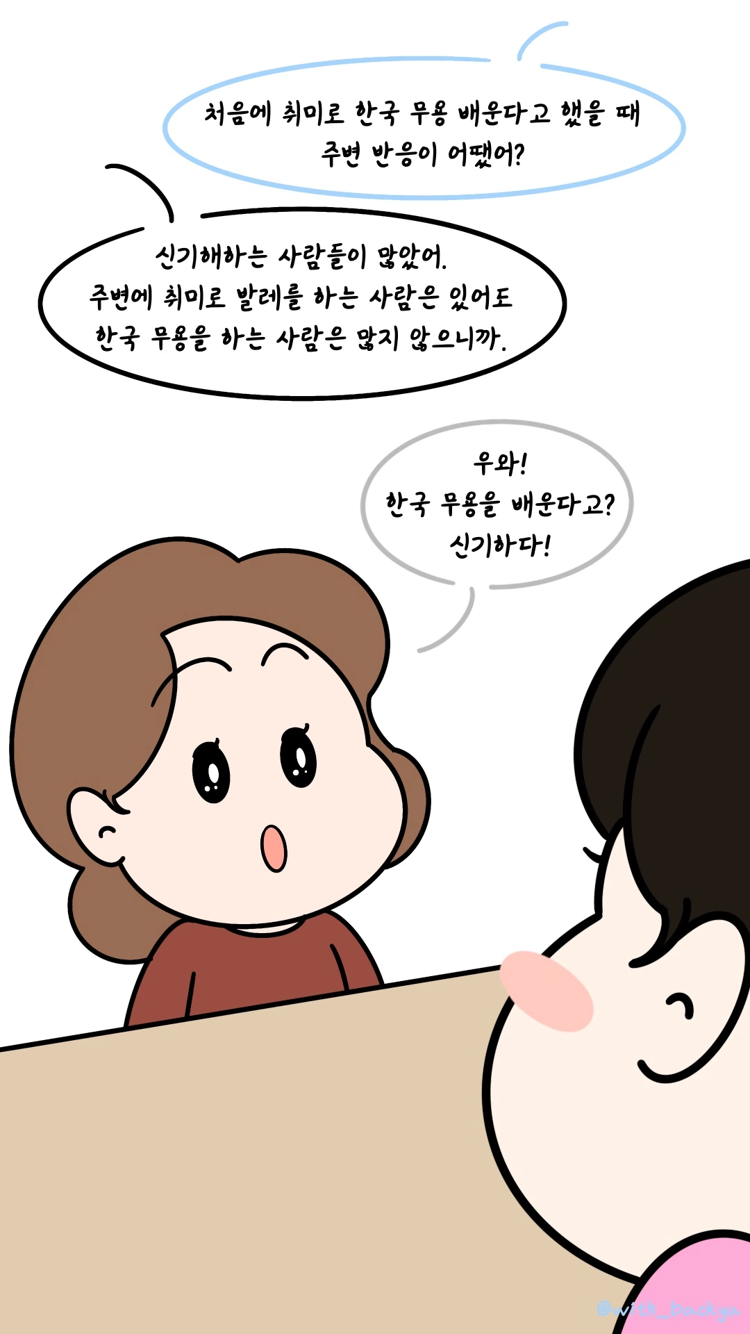 (친구_우와! 한국 무용을 배운다고? 신기하다!)