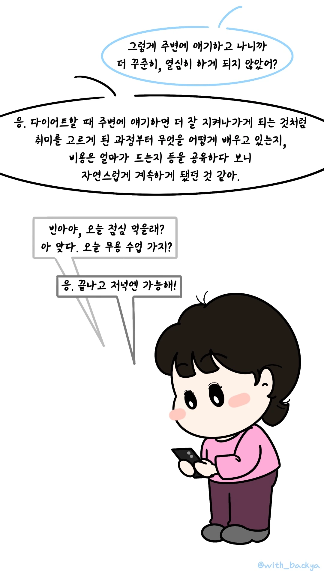 (친구_빈아야, 오늘 점심 먹을래? 아 맞다. 오늘 무용 수업 가지?